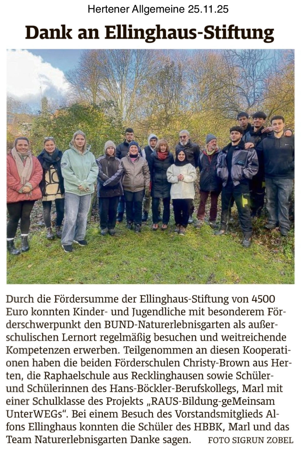 Durch die Fördersumme der Ellinghaus-Stiftung von 4500 Euro konnten Kinder und Jugendliche mit besonderem Förderschwerpunkt den BUND-Naturerlebnisgarten als außerschulischen Lernort regelmäßig besuchen und weitreichende Kompetenzen erwerben. Teilgenommen an diesen Kooperationen haben die beiden Förderschulen Christy-Brown aus Herten, die Raphaelschule aus Recklinghausen sowie Schüler und Schülerinnen des Hans-Böckler-Berufskollegs Marl mit einer Schulklasse des Projekts „RAUS-Bildung-geMeinsam UnterWEGs“. Bei einem Besuch des Vorstandsmitglieds Alfons Ellinghaus konnten die Schüler des HBBK Marl und das Team Naturerlebnisgarten Danke sagen.